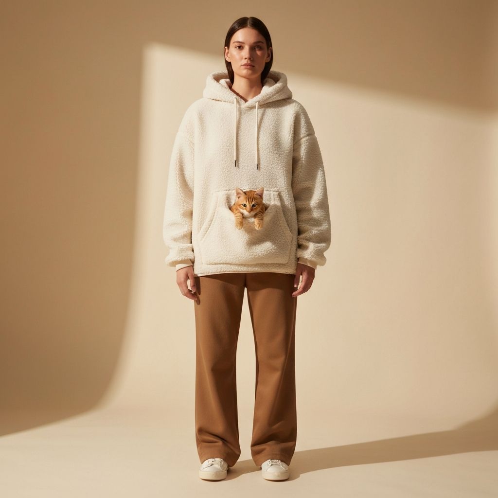 A heavyweight sherpa fleece with a front-facing pouch — big enough for your pet, cozy enough for you.